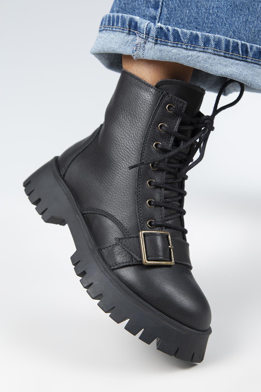 Manijero (Mihri) Kadın Hakiki Deri Bağcıklı İçten Fermuarlı Üstten Tokalı Siyah Bot